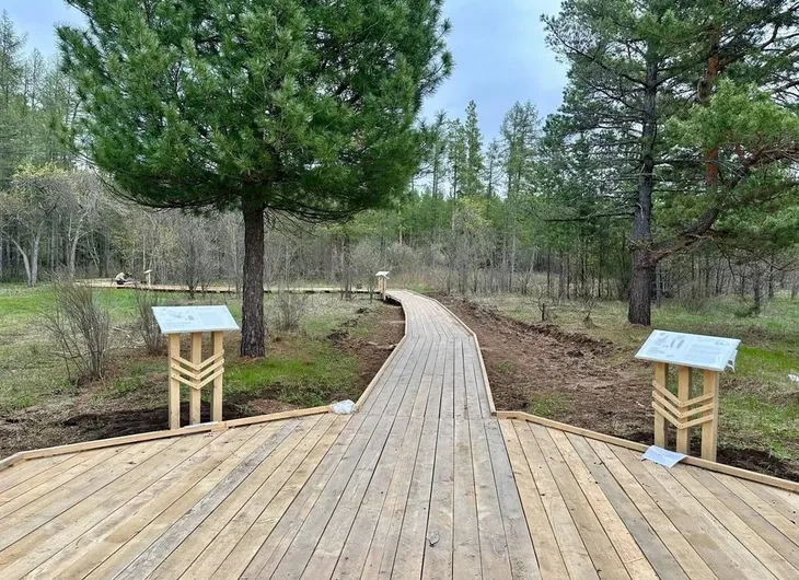 Основу маршрута подготовили еще прошлой осенью: проложили около 700 метров удобной тропы с защитными бортиками, чтобы по ней могли передвигаться даже люди на колясках, а также оформили входную зону.